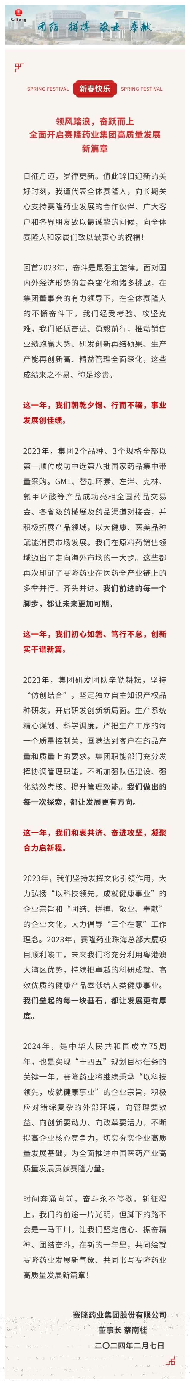 賽隆藥業集團董事長蔡南桂致新春賀詞